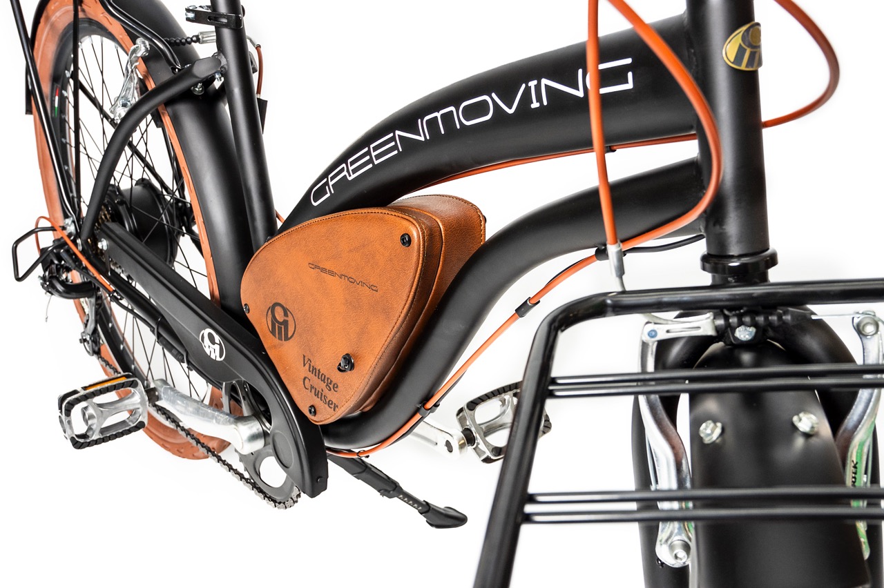 Cruiser Vintage E-Bike è un esemplare realizzato con cura per il design e l’estetica in ogni dettaglio. La borsa porta batteria è inserita con sobrietà all’interno del telaio, e custodisce l’intera elettronica della bici. La batteria agli ioni di litio Panasonic risulta essere al momento la migliore scelta in termini di qualità e durata nel panorama delle e-bike. La centralina sviluppata secondo una tecnologia sensorless Sine Wave garantisce una guida confortevole, morbida e silenziosa. Il suo design, arricchito da un sobrio indicatore di carica analogico non disturba la vista e si integra alla perfezione con le linee del mezzo, preservando il suo aspetto esteriore e le sue funzionalità.